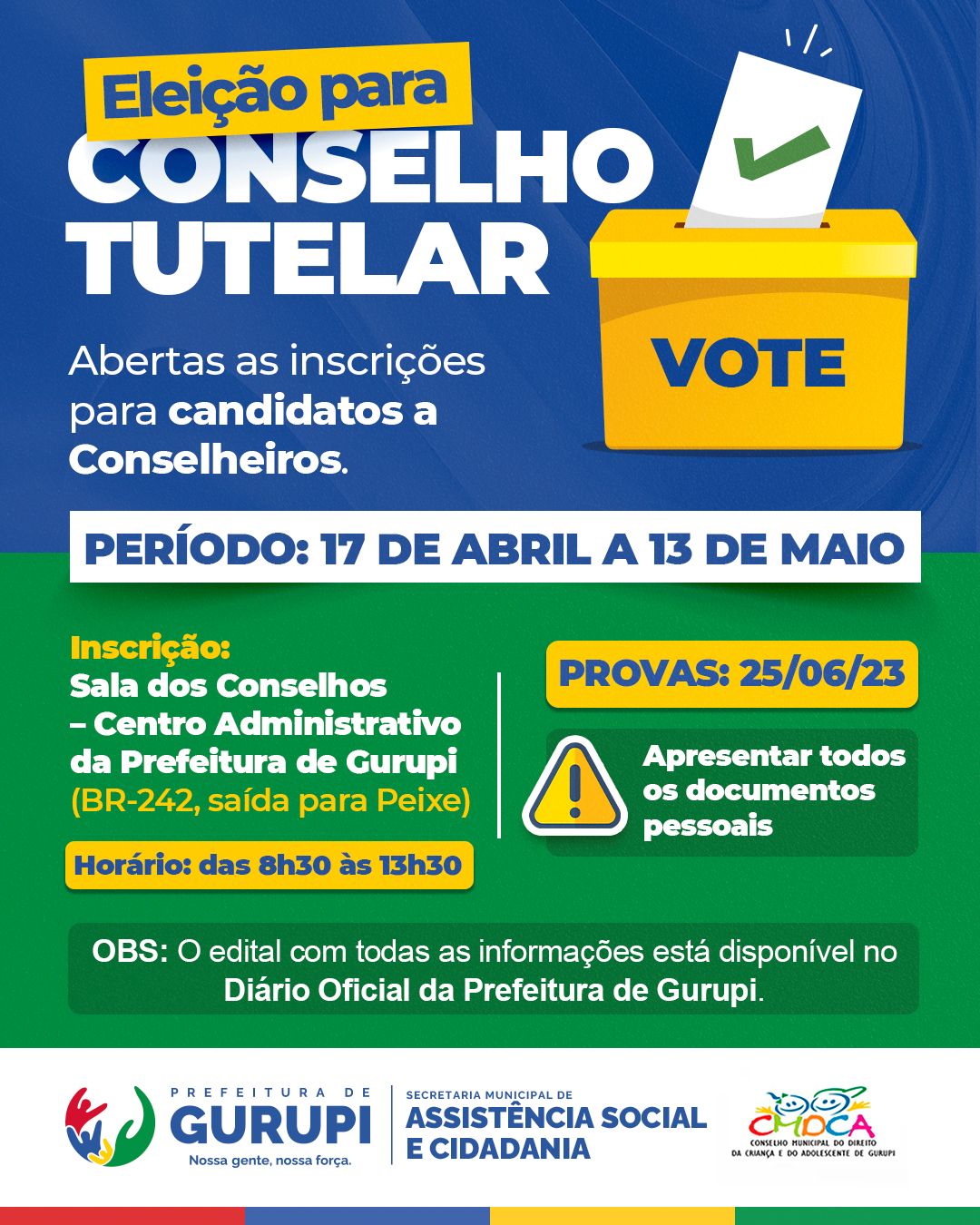 Seguem abertas até o próximo dia 13 as inscrições para Conselheiro Tutelar de Gurupi. Os interessados devem procurar a Sala dos Conselhos, localizada no Centro Administrativo da Prefeitura de Gurupi (BR-242, saída para Peixe), no horário das 08h30 às 13h. A inscrição é gratuita.