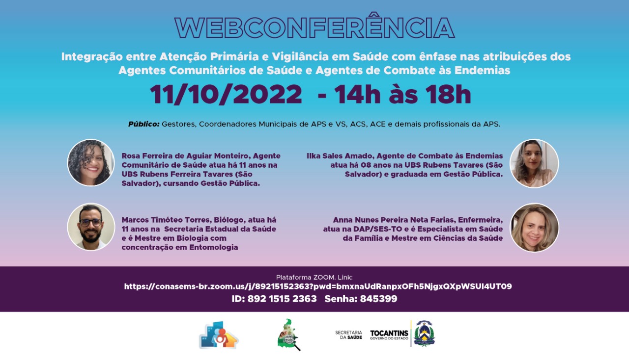 Além dos ACE e ACS a webconferência é destinada aos gestores, coordenadores municipais de atenção primária e de vigilância em saúde de todo o Tocantins.  A transmissão será feita pela plataforma Zoom, através do link  https://conasems-br.zoom.us/j/89215152363?pwd=bmxnaUdRanpxOFh5NjgxQXpWSUl4UT09, ID: 892 1515 2363 e senha: 845399. E, também terá transmissão simultânea no Canal da Saúde no YouTube, por meio do link: https://www.youtube.com/channel/UCDu1wzoAee_wBI0faP_43Vg