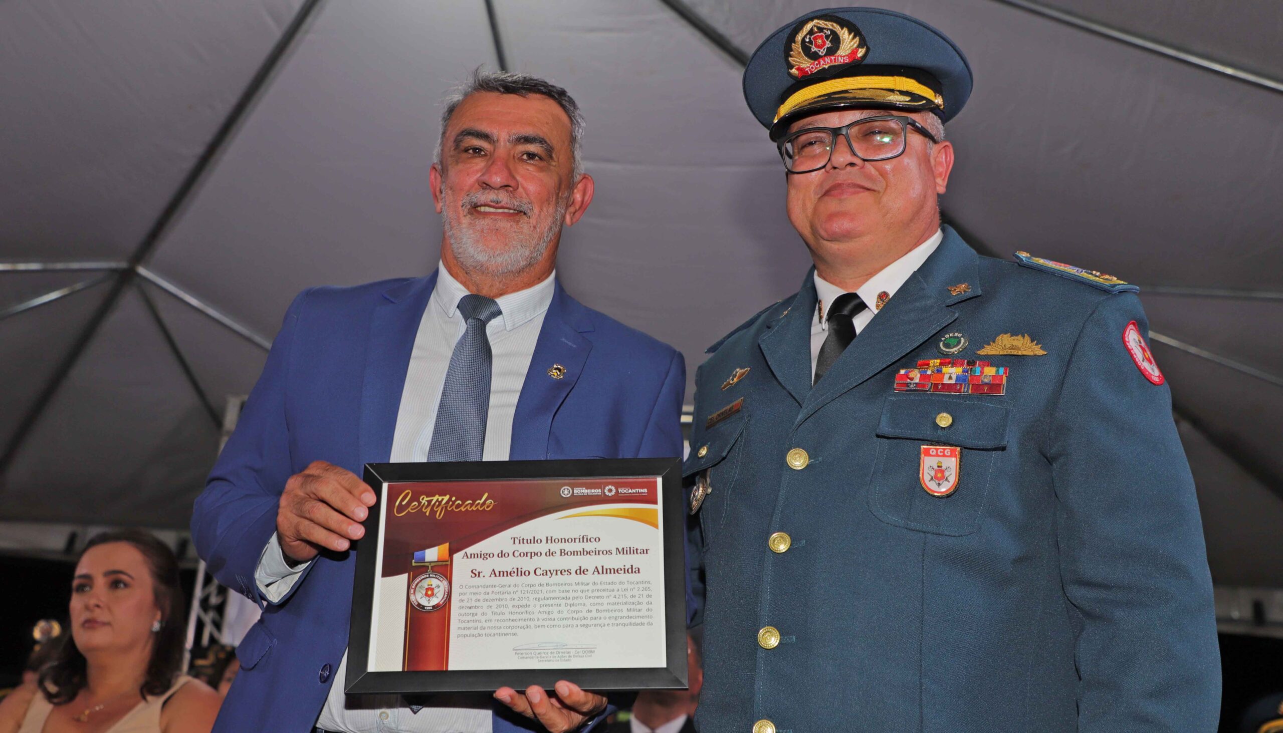 O Título Honorífico Amigo do Bombeiro, baseado na Lei nº 2.265 de 21 de dezembro de 2010, reconhece formalmente aqueles que contribuem para o crescimento e a segurança da corporação e da população tocantinense. Além do governador em exercício, Amélio Cayres, outras autoridades civis e militares foram agraciadas com a comenda. Dentre elas, servidores e gestores do Governo do Tocantins.