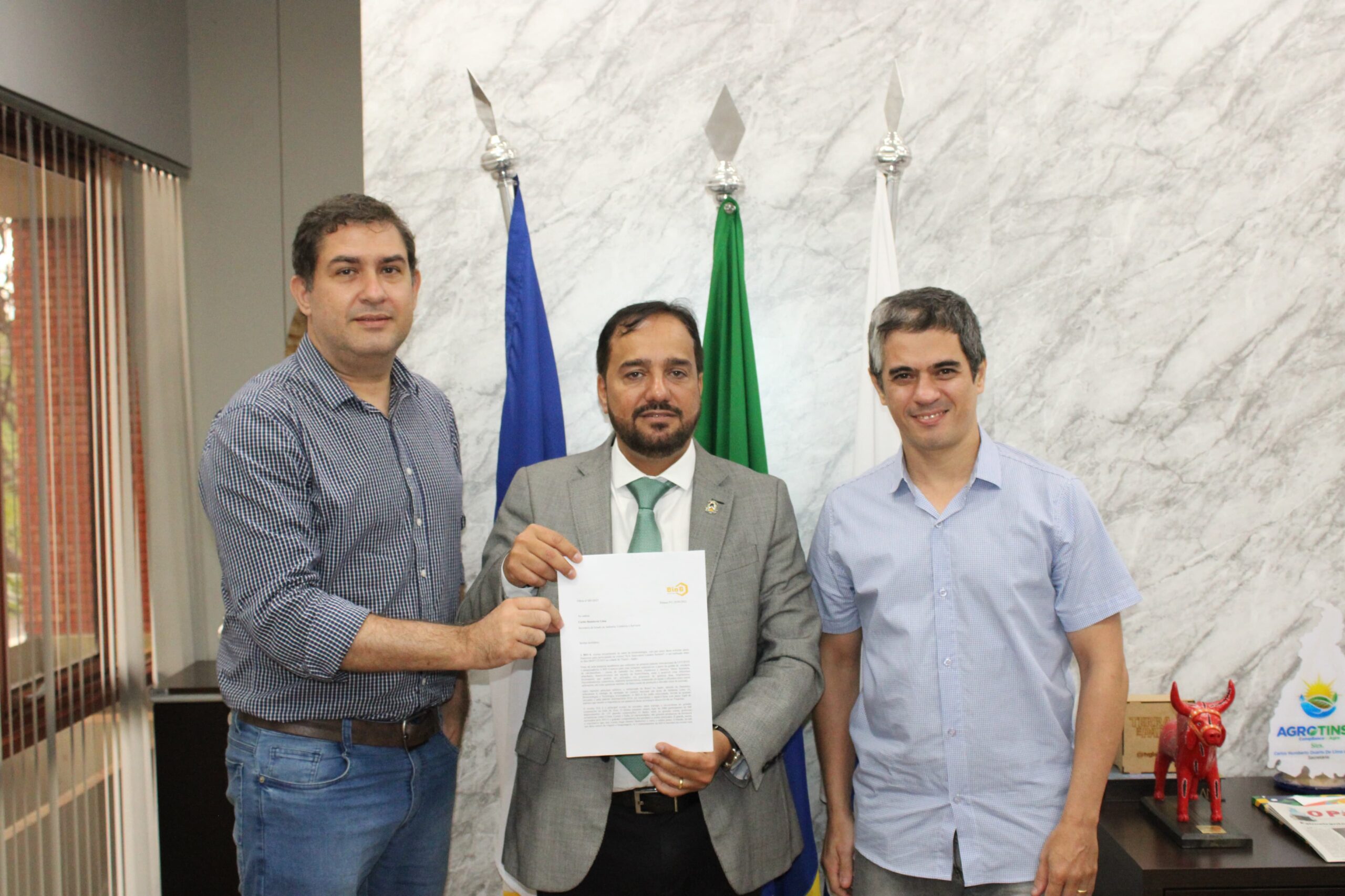 O Secretário da Indústria, Comércio e Serviços (Sics), Carlos Humberto Lima, na manhã desta quinta-feira, 28, recebeu em seu gabinete, os Professores do Instituto Federal do Tocantins (IFTO), Marcus André Oliveira e Éber Souza, representantes da empresa BIO 6 Sustentável, para discutir sobre tecnologia e inovação.