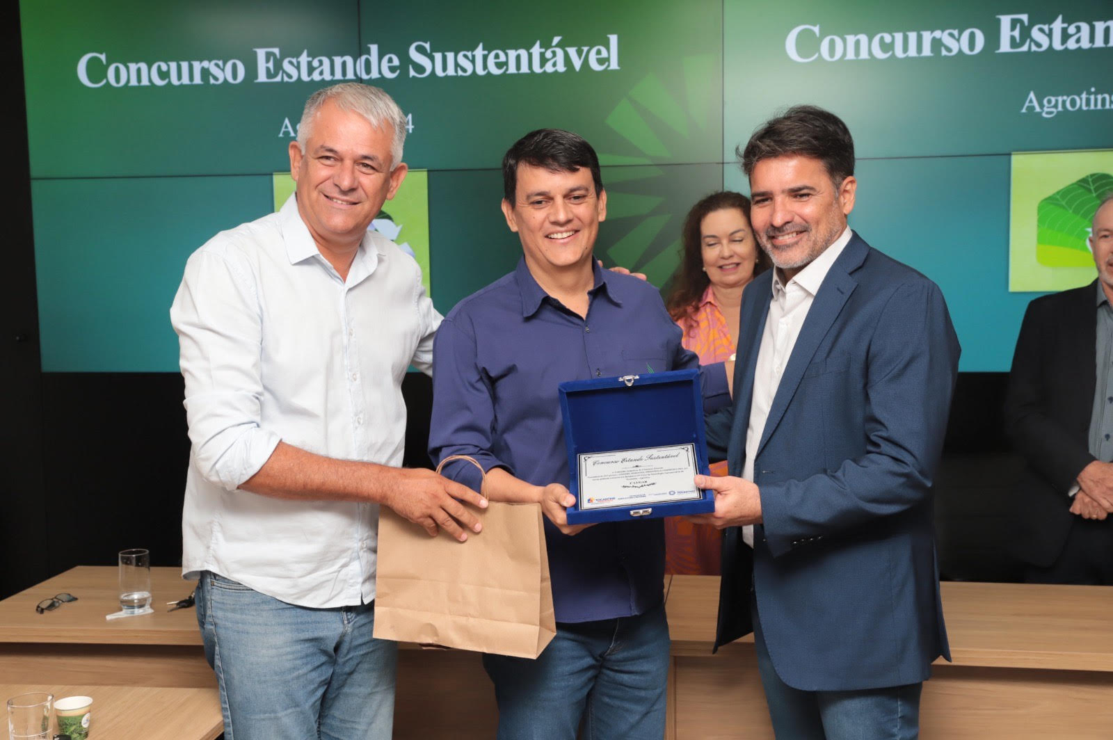 Os expositores da 24ª Feira de Tecnologia Agropecuária do Tocantins (Agrotins) premiados no Concurso Estande Sustentável promovido pelo Governo do Tocantins, por meio da Secretaria do Meio Ambiente e Recursos Hídricos, em parceria com a Secretaria da Agricultura e Pecuária (Seagro), receberam a premiação nesta quarta-feira,5, em solenidade realizada na sala de reuniões da Semarh.