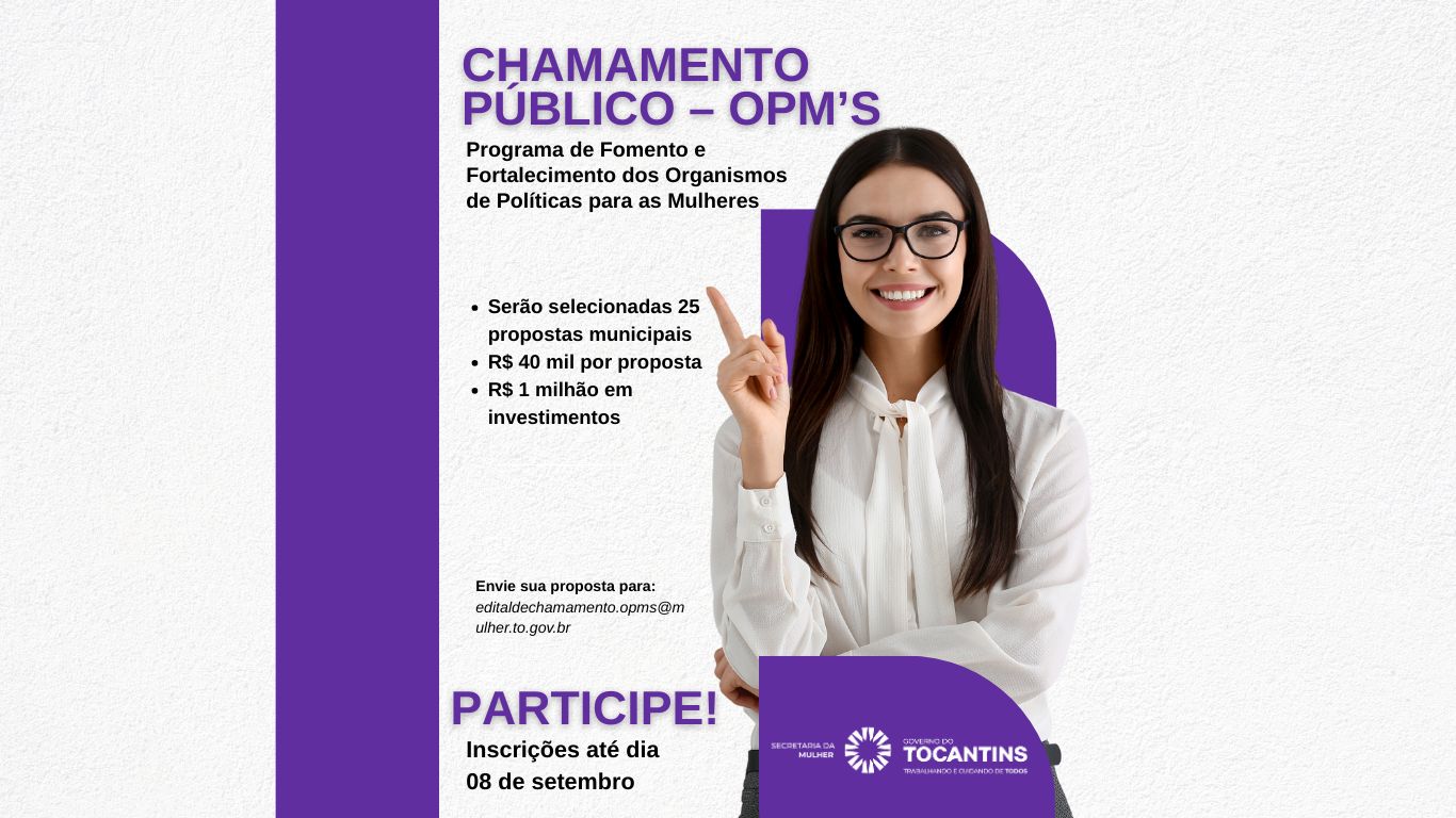 O Governo do Tocantins, por meio da Secretaria de Estado da Mulher (SecMulher), publicou na última terça-feira, 19, o Edital de Chamamento Público nº 03/2025, que visa selecionar 25 propostas de municípios para o fortalecimento dos Organismos de Políticas para as Mulheres (OPM’s). O objetivo é apoiar financeiramente a implementação de ações estratégicas locais voltadas à promoção da autonomia e da igualdade de gênero.