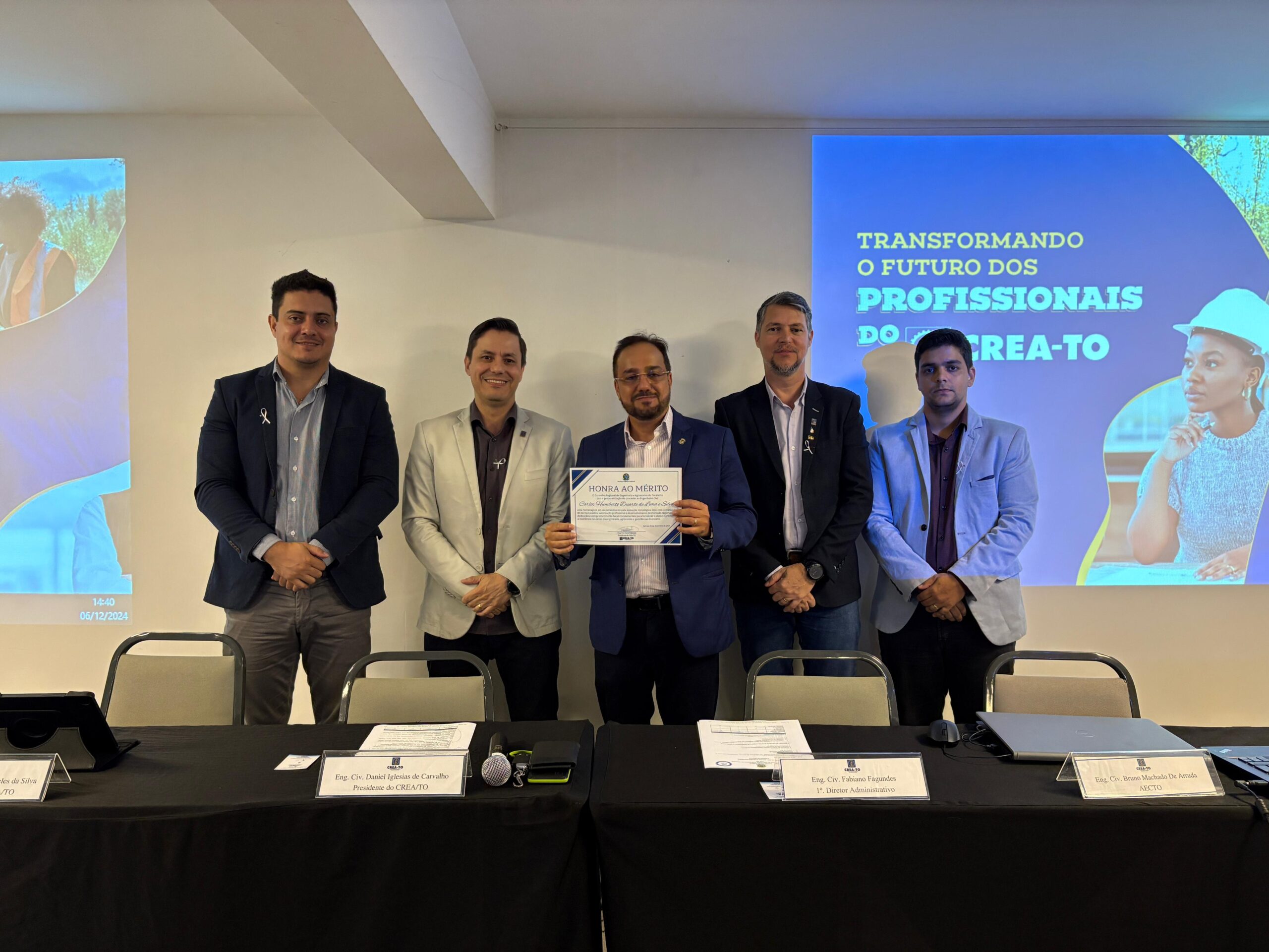 O Secretário de Indústria, Comércio e Serviços (Sics), Carlos Humberto Lima, recebeu nesta sexta-feira (06) o Certificado de Honra ao Mérito do Conselho Regional de Engenharia e Agronomia do Tocantins (CREA-TO), em reconhecimento à sua contribuição pela inovação tecnológica, zelo com a prestação do serviço público, valorização profissional e desenvolvimento do mercado regional. “Sua dedicação e comprometimento foram fundamentais para fortalecer a classe e promover a excelência nas áreas da engenharia, agronomia e geociências do estado”, afirma o documento. A cerimônia ocorreu durante a IV Semana da Engenharia do CREA-TO, em Palmas.